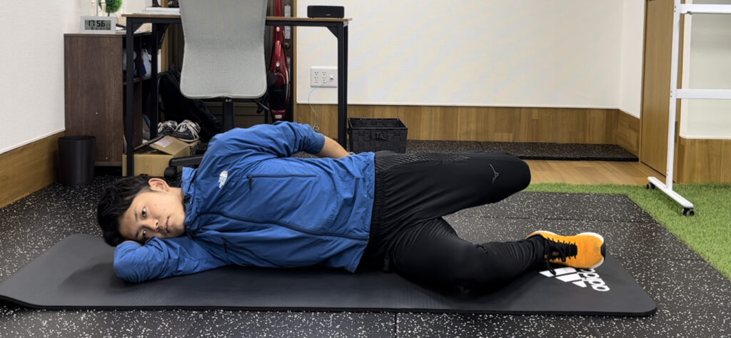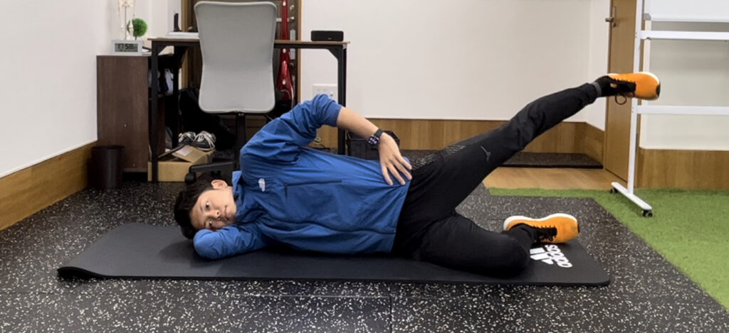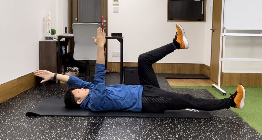 ①下の足は曲げて上の足は伸ばしたまま上下に動かします