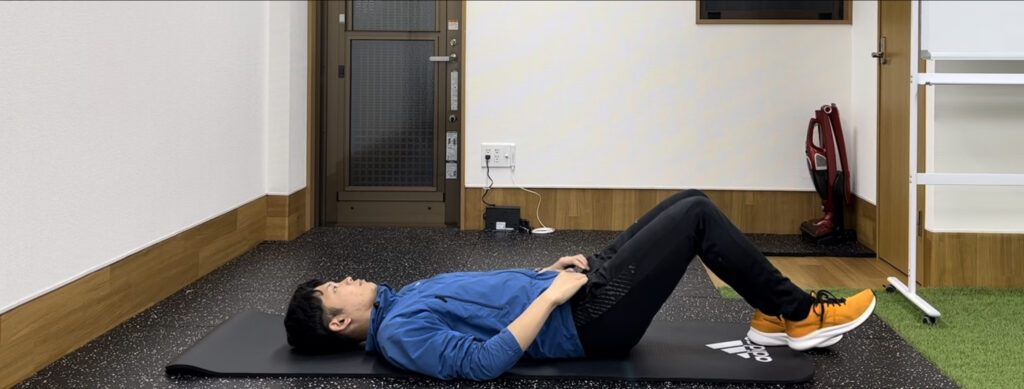 横向きで寝て上の足の甲を持って後ろに引っ張る。20秒キープしましょう。
