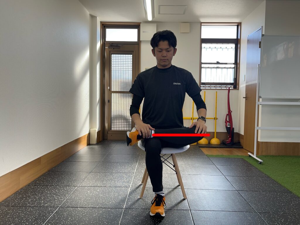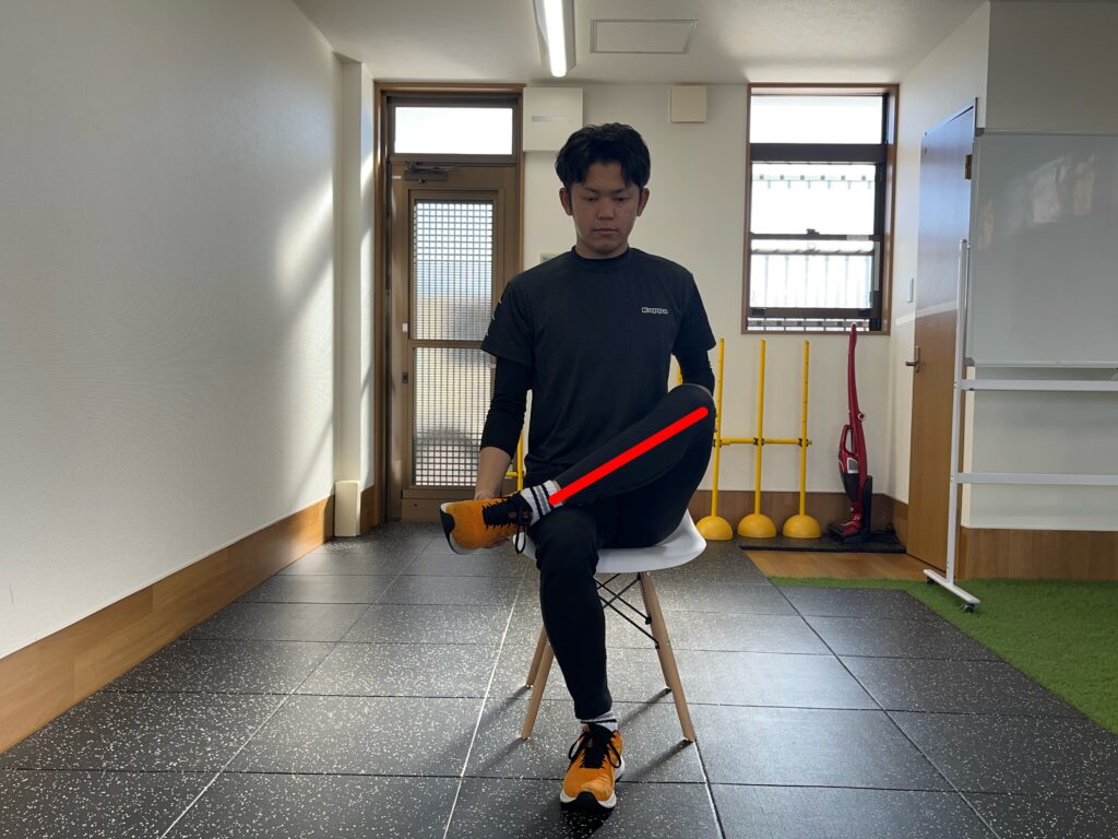 - イスに座り片方の膝の上に足を置きます(お尻が硬い選手はこの姿勢をとるだけでも大変です)