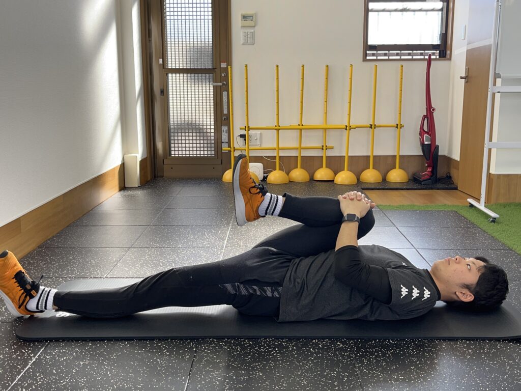 ・反対側の膝が浮いてしまう、もしくは骨盤が動いてしまう場合抱えている方と反対側の股関節の前の筋肉が硬いことが考えられます