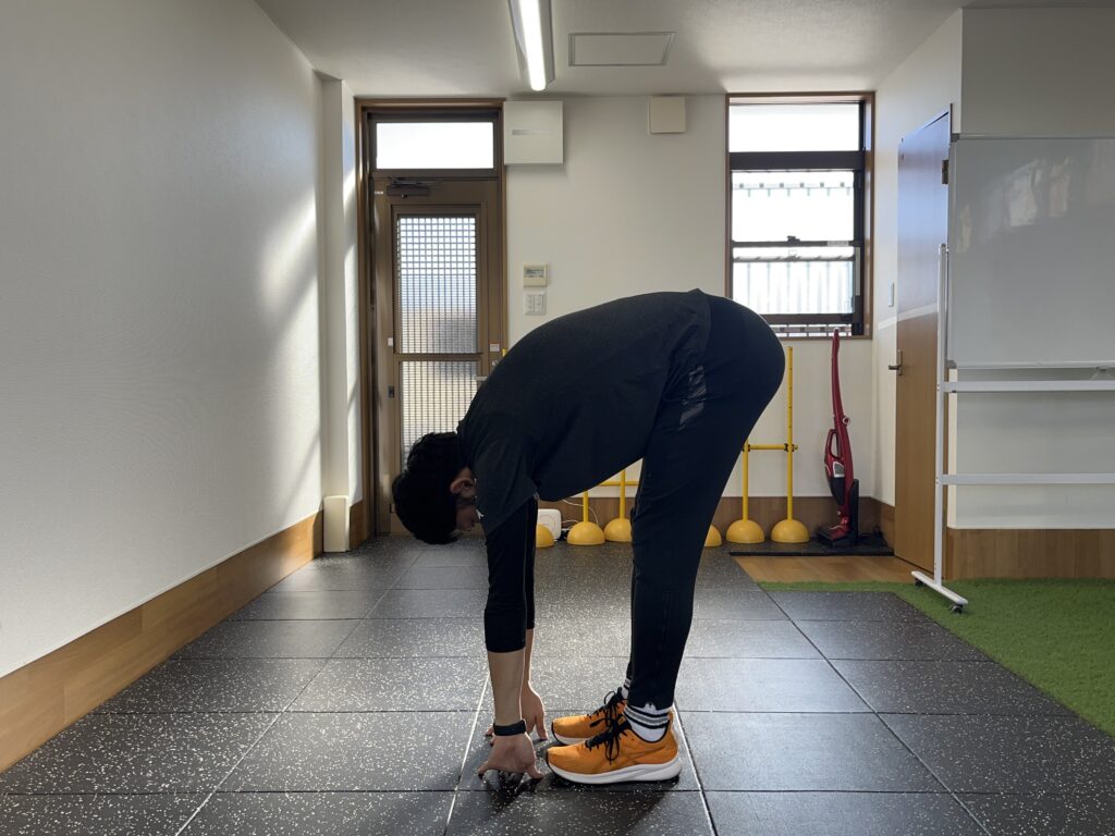 - 足はそろえた状態で前屈します、この時に膝が曲がらないように注意します