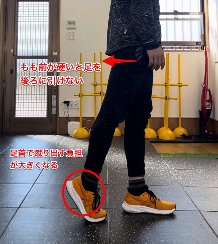 つまり、太ももの前が硬くなると足を後ろに引けなくなりふくらはぎが過剰に使われアキレス腱に痛みが出ます。