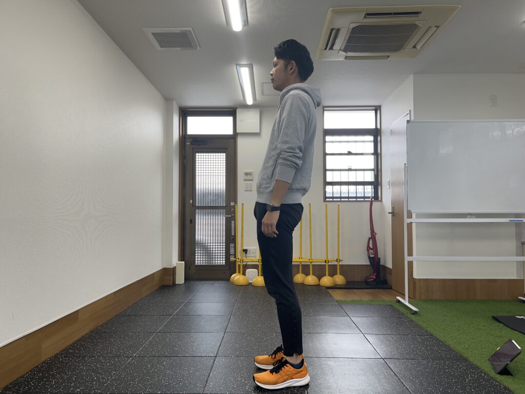 この姿勢はふくらはぎが硬くなり、太ももの前も硬くなる姿勢です。つまり、先ほどの2つの原因は姿勢が悪いからアキレス腱に痛みが出てしまうのです。