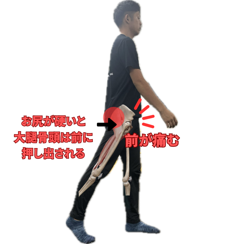 つまり、痛い場所は股関節の前ですがお尻の筋肉が硬いことが根本的な原因となります。