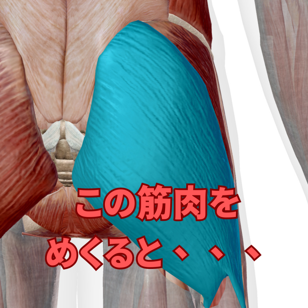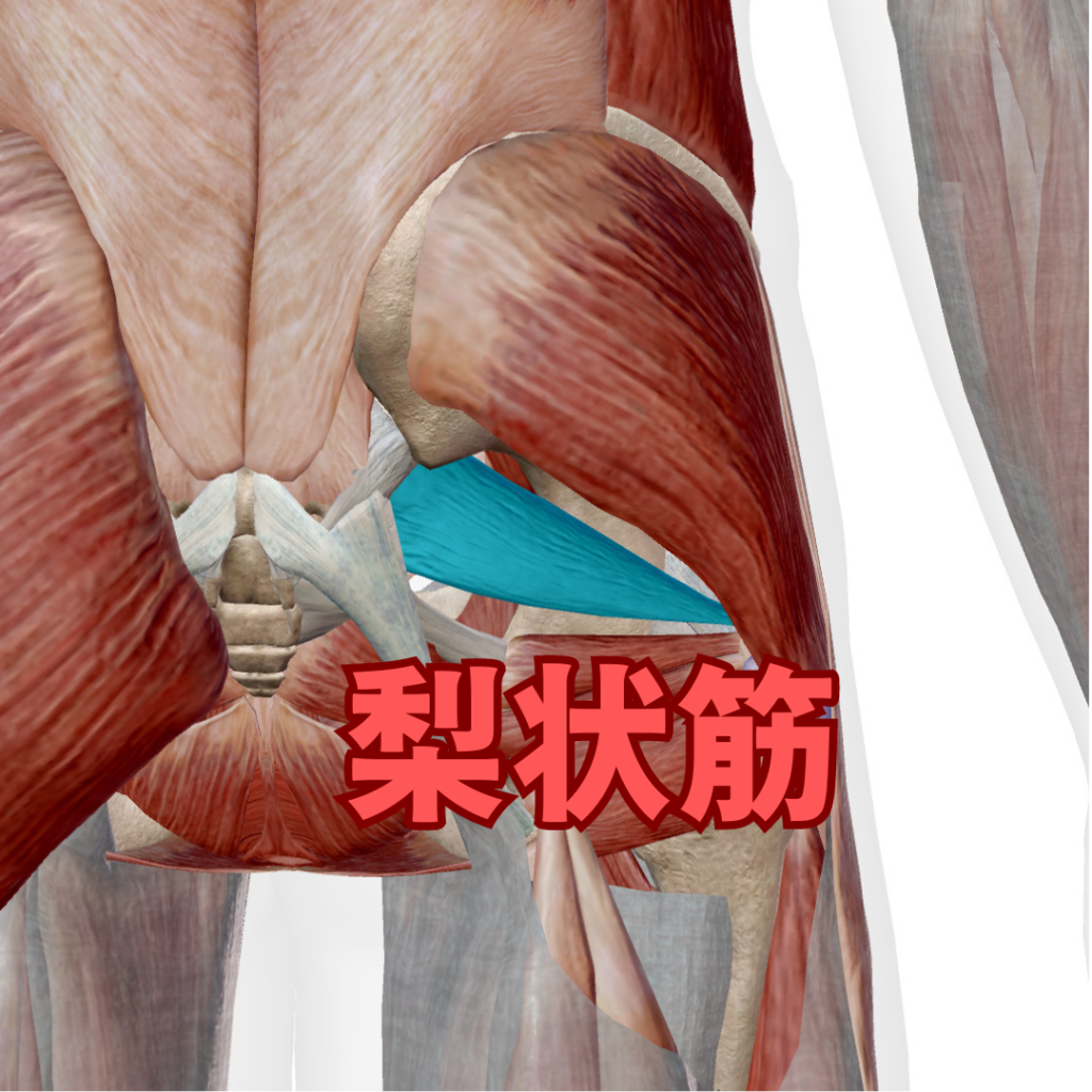 お尻の表面の筋肉をペラっとめくった、一番奥にある筋肉が梨状筋(りじょうきん)と言われる筋肉でここが硬くなります。梨状筋を柔らかくしていきましょう。