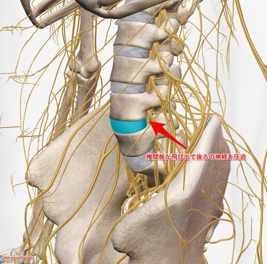 ヘルニアはお尻や足のほうへ行く神経を圧迫しているので症状はお尻の痛みや足のしびれが出現するのです。