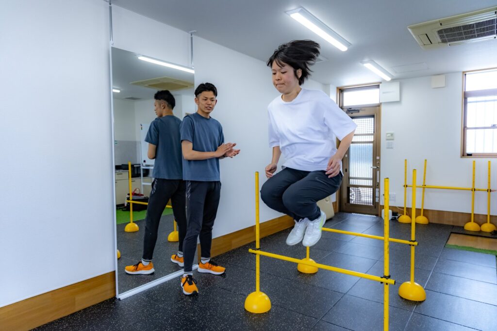 さらに、サッカーやバスケ、バレーなどほとんどのスポーツで必要な瞬発力トレーニングを行い競技動作に近づけていきます。競技動作を考慮したトレーニングを行い不安なく競技復帰できるようにします。