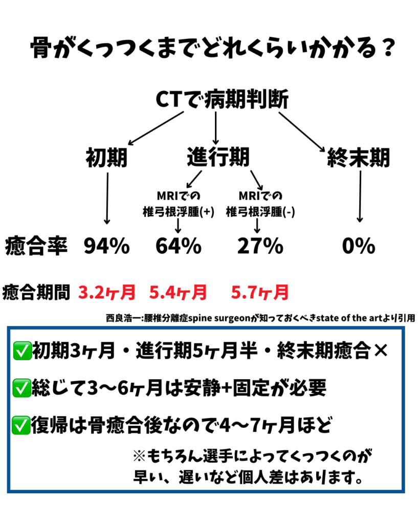 その為、個人的には骨癒合後は部分復帰して1か月かけて完全復帰していくのが良いと思っています。