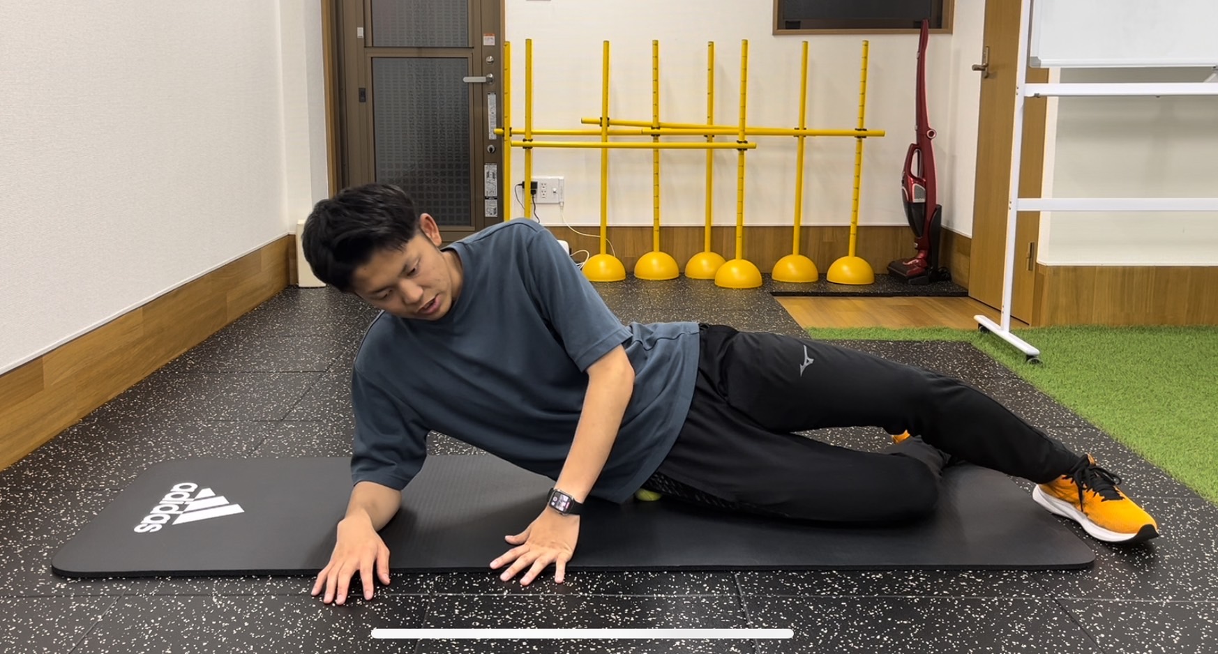 やり方は、テニスボールを用意して下記の写真のようにお尻にボールを当てます。ボールを当てたら左右に動いて痛気持ちいところでゴロゴロと転がします。これを1分間やりましょう。
