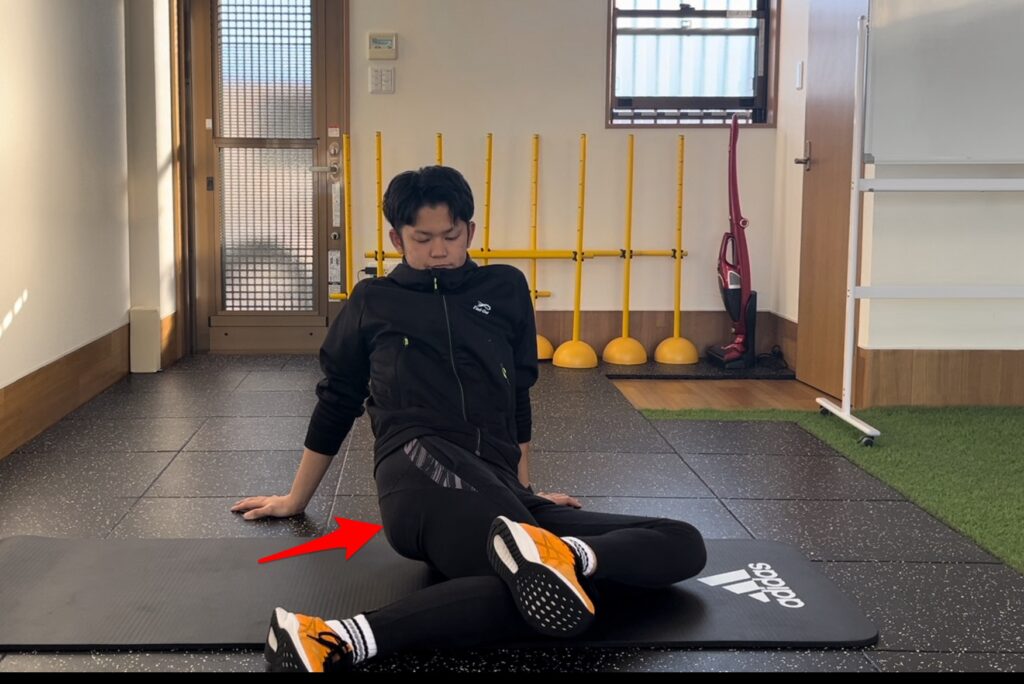 手を後ろについて足を画像のように乗せます。そのまま足を斜めに倒すとお尻が伸びてくる感覚が分かると思います。この状態で30秒ストレッチしましょう。
