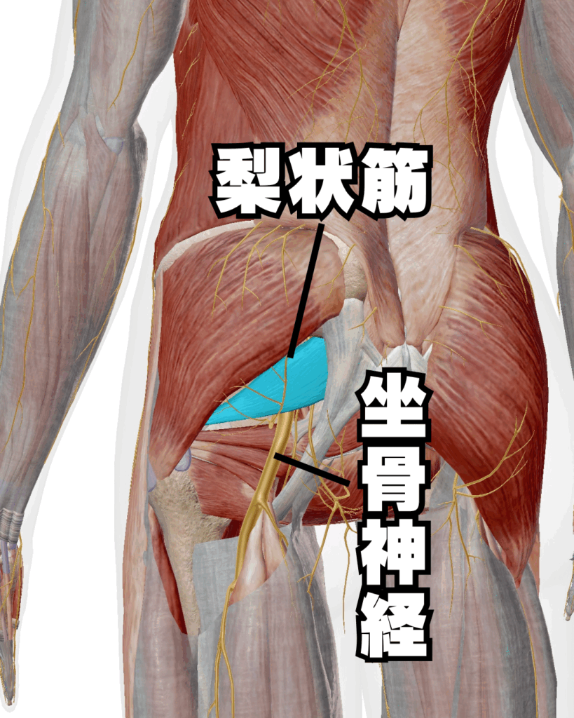 長時間同じ姿勢が続くと梨状筋が坐骨神経を圧迫して痛みに繋がるのです。