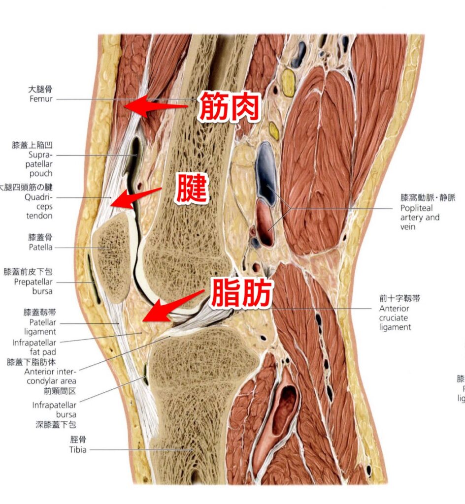 膝を曲げたり、伸ばしたりするときに上下に動くのですが、お皿周りの筋肉や靭帯、脂肪組織が硬くなるとお皿の動きが悪くなります。
