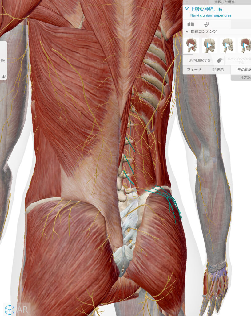 上殿皮神経は、腰の背骨(腰椎)から出て、お尻の外側を通りながら皮膚の感覚を担当している感覚神経です。