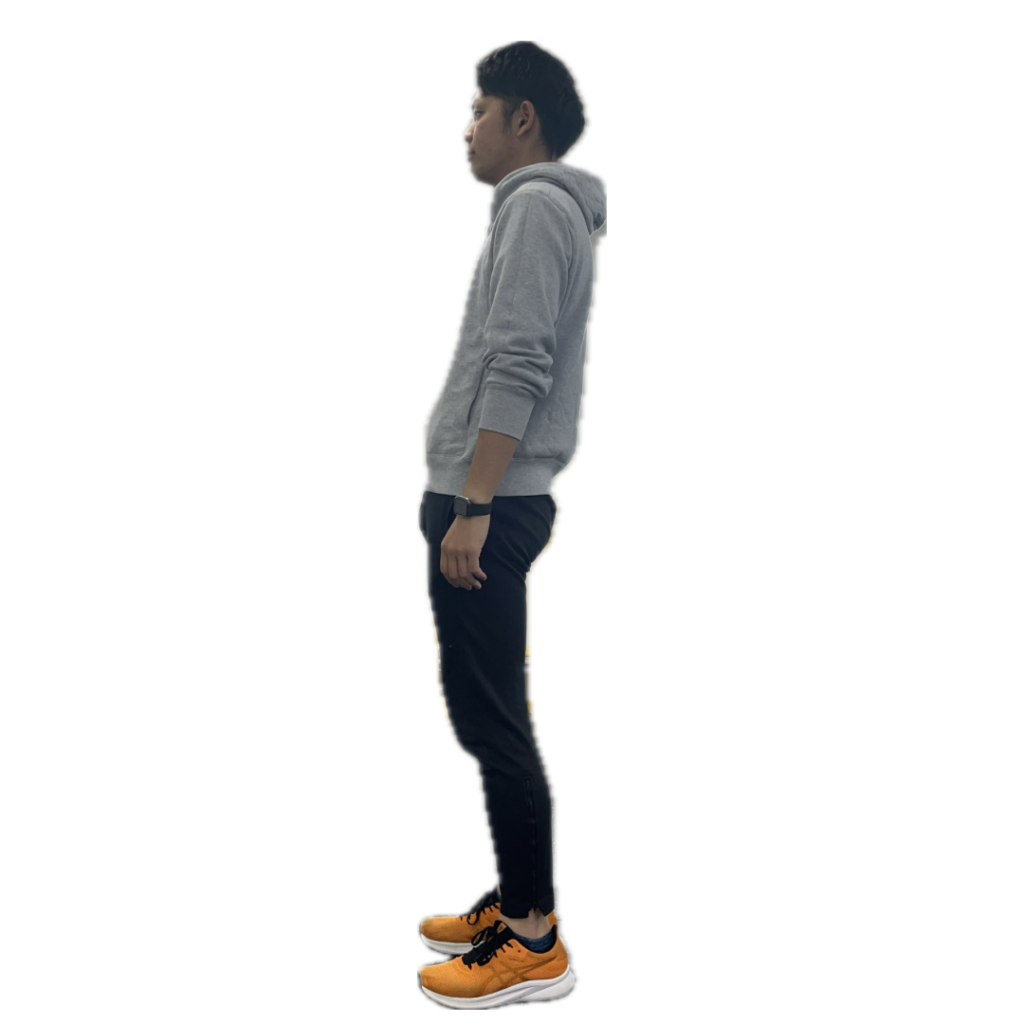 この姿勢だと後方重心になり、かかとに体重がかかりやすくなります。