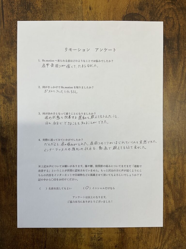 段々と肩の痛みが取れました。肩周りの凝りがほぐれていくのを実感できました。インナーマッスルの強化の仕方も動画で教えてもらえて良かった。
