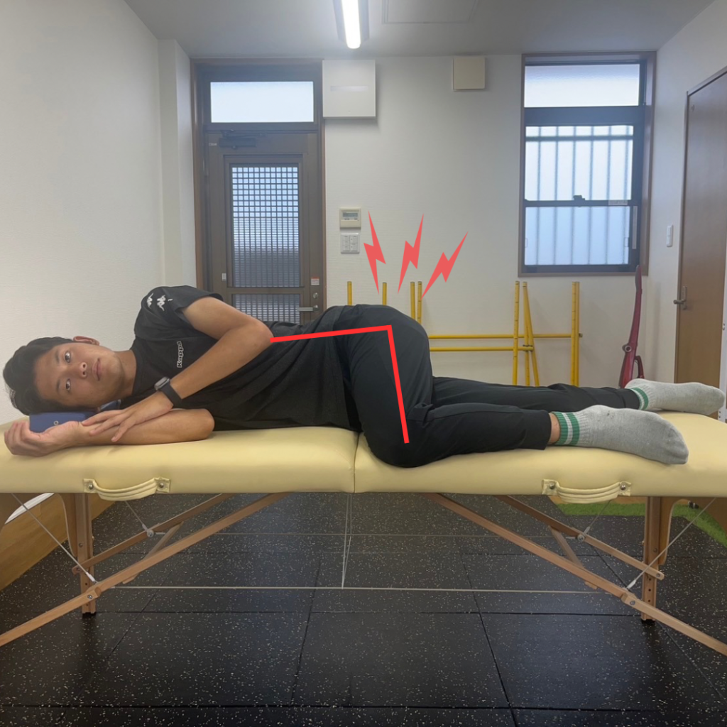 恐らく、横向きで寝た時下記のような態勢になると痛いと思います。