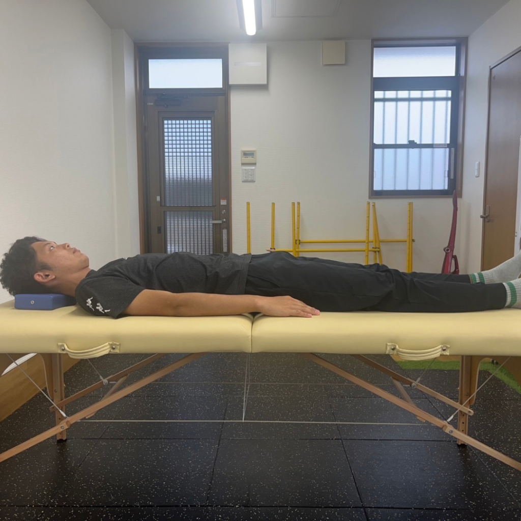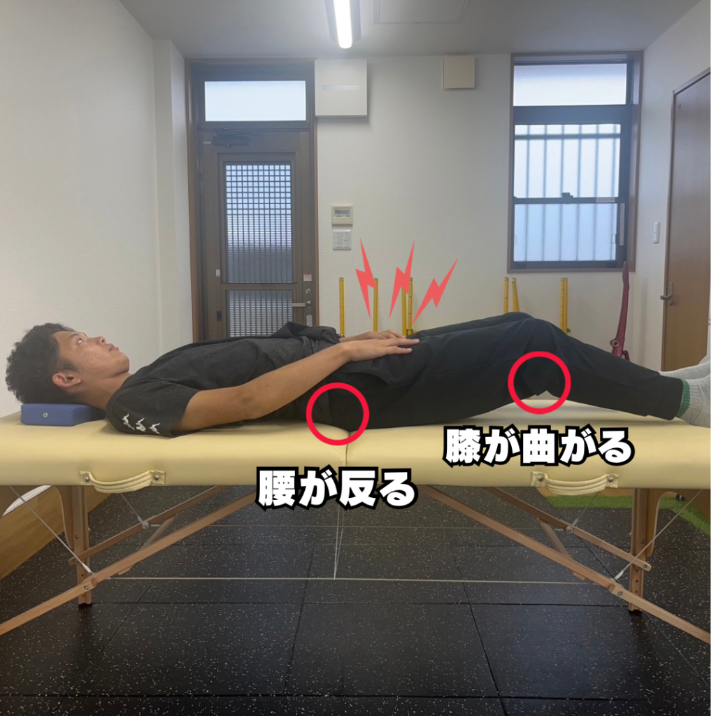 通常仰向けで寝る時は膝を真っすぐ伸ばして寝ると思いますが、もも前の筋肉が硬くなると、腰が反って、膝が曲がります。