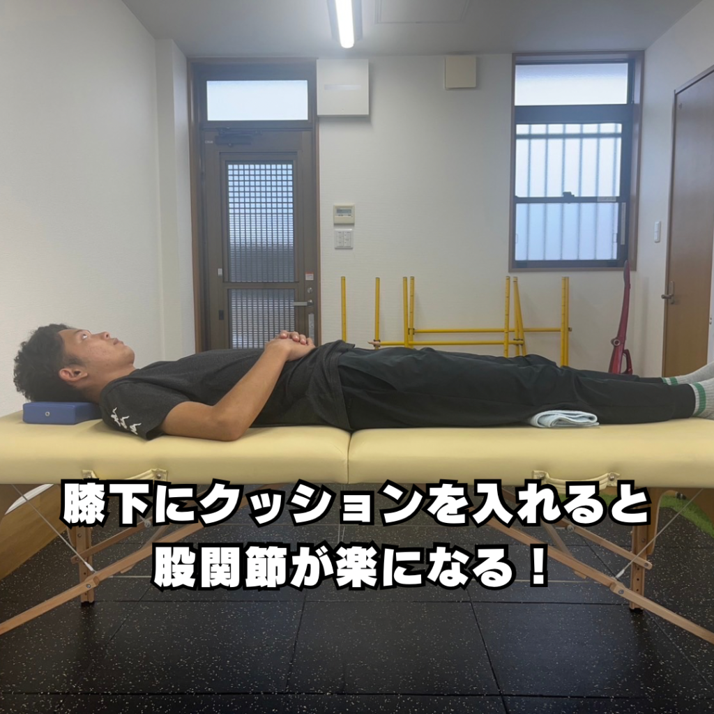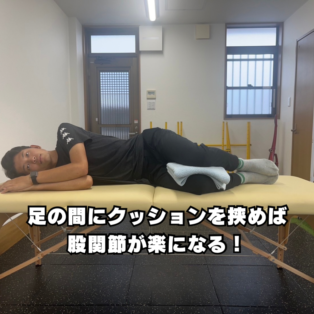 こうすることで太ももの前の筋肉の緊張がゆるみ股関節の痛みが軽減します。