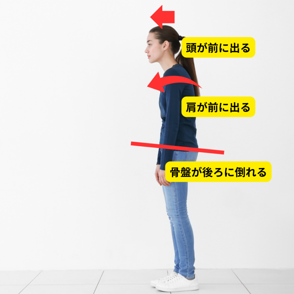 このような状態になると体の前後で筋肉のバランスが悪くなり肩こりや腰痛が出てしまいます。