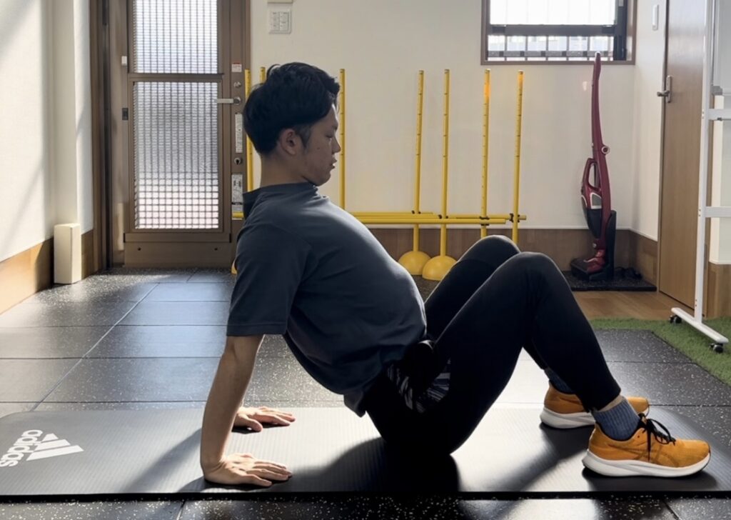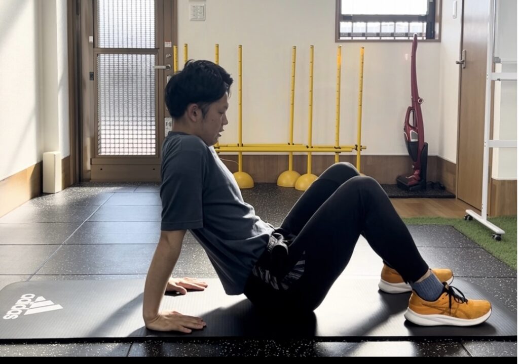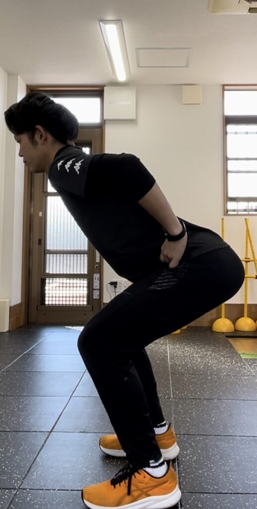 ①背筋をまっすぐして体を前に倒す。ももうらが伸びてくれば正解です。