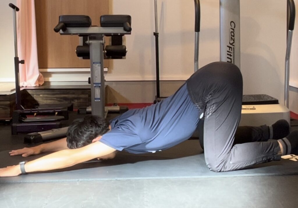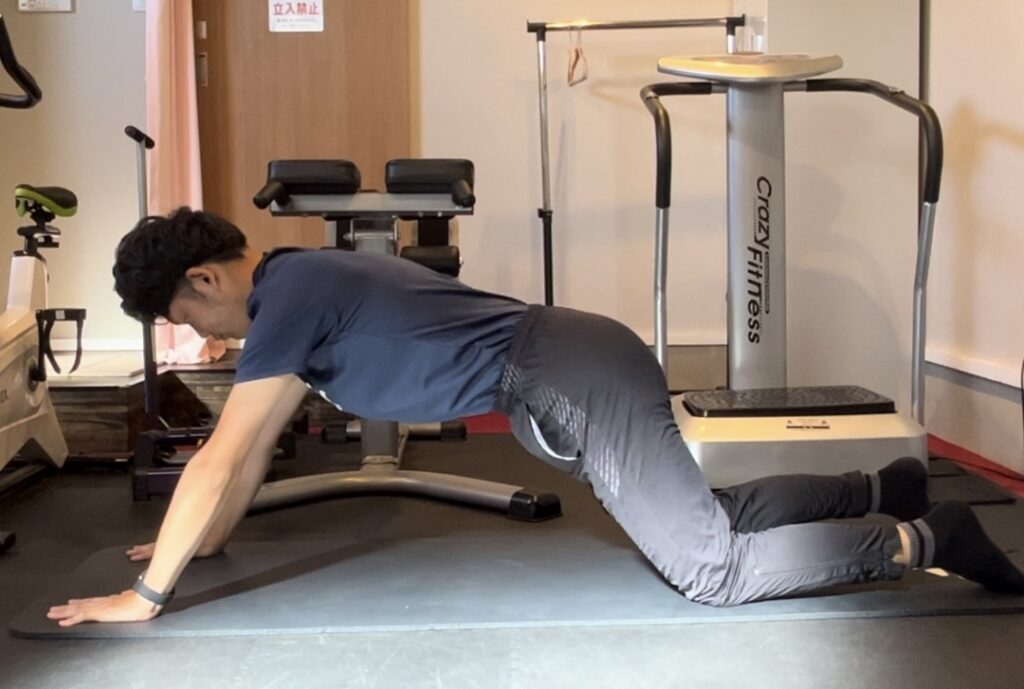 ②胸を前に突き出します。丸くする、胸を張らすの繰り返しを行いましょう。